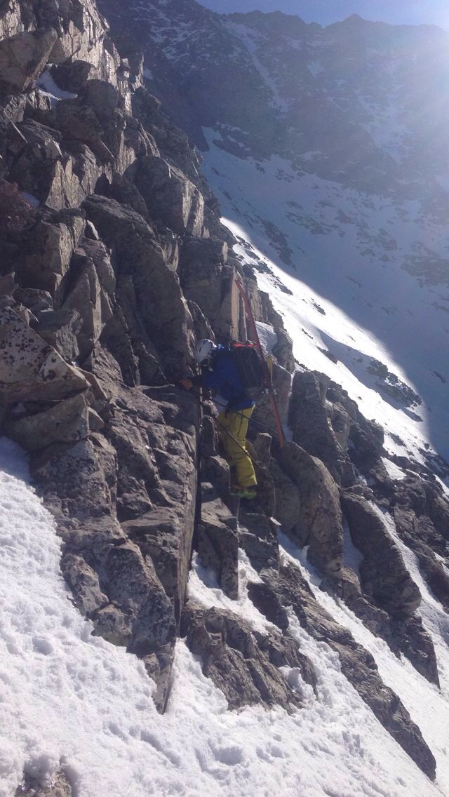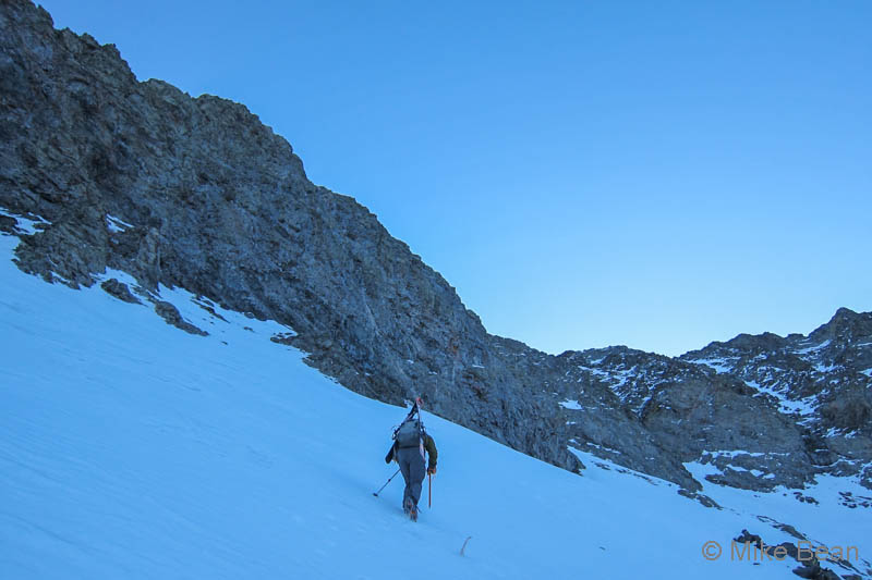 We were dreading the ski on the way up, but it turned out to just be fun and fast. Once out of the hourglass we zipped as far as we could along the ridge, then it was back to crampons.