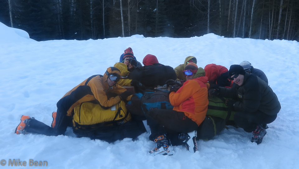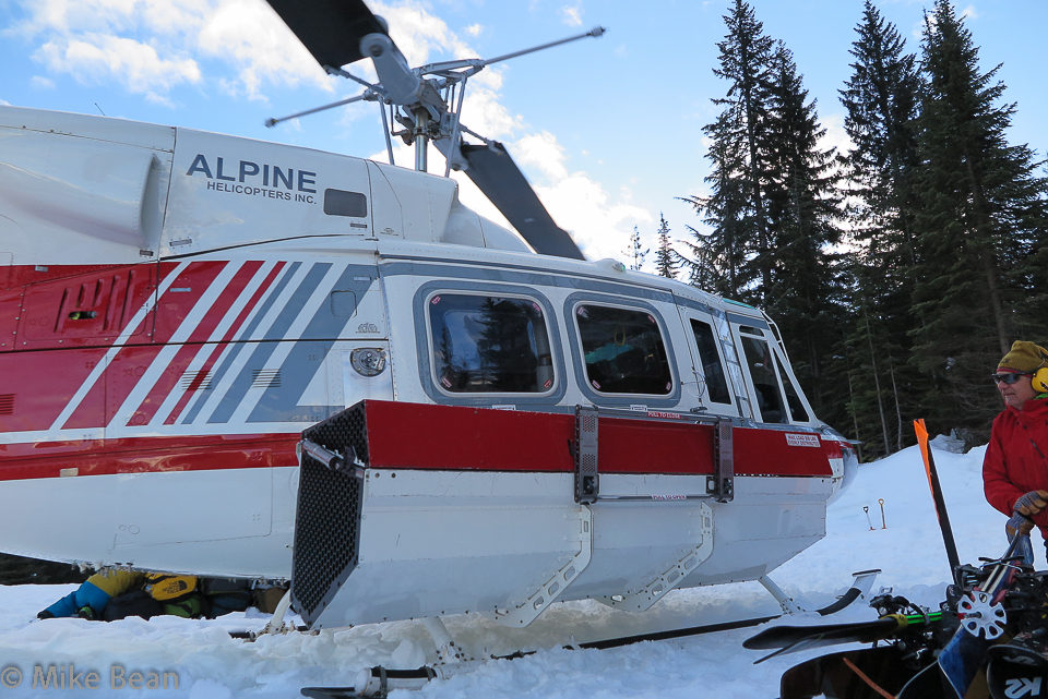 We made good time and caught up quickly, just as the group was ready to head up to the Swiss Col and ski some laps. In a terrible turn of events, Howie had a crash and blew his knee on the first lap. Fortunately Great Canadian Heliskiing was able to get him back across the valley to the lodge, where he hung out for the rest of the week. Thomas also managed to blow up the walk-mode in his boots, locking it in to a far-forward ski mode, leading to a difficult skin back to the lodge but an easy-enough repair that evening.