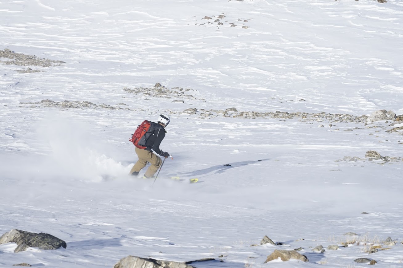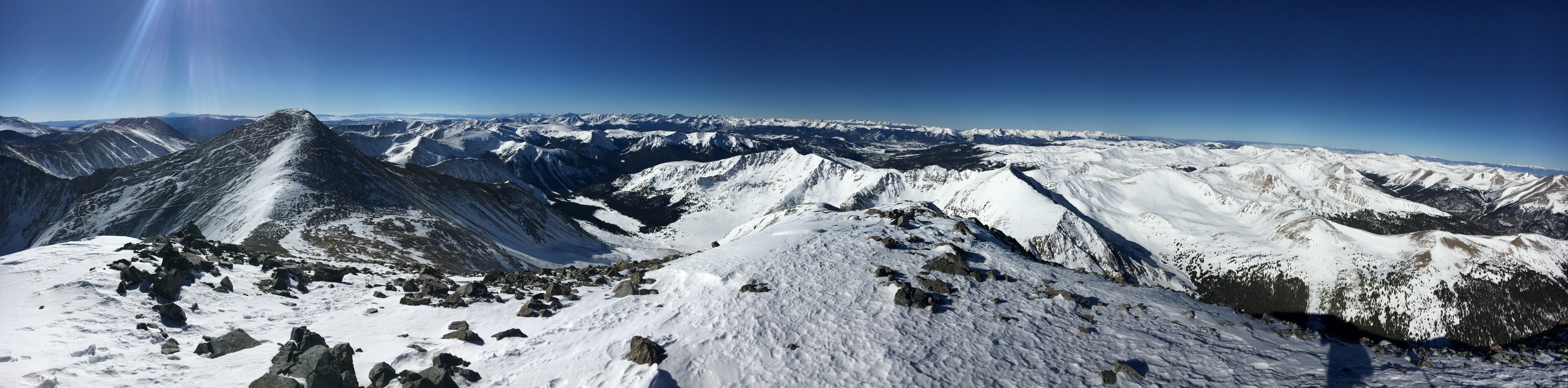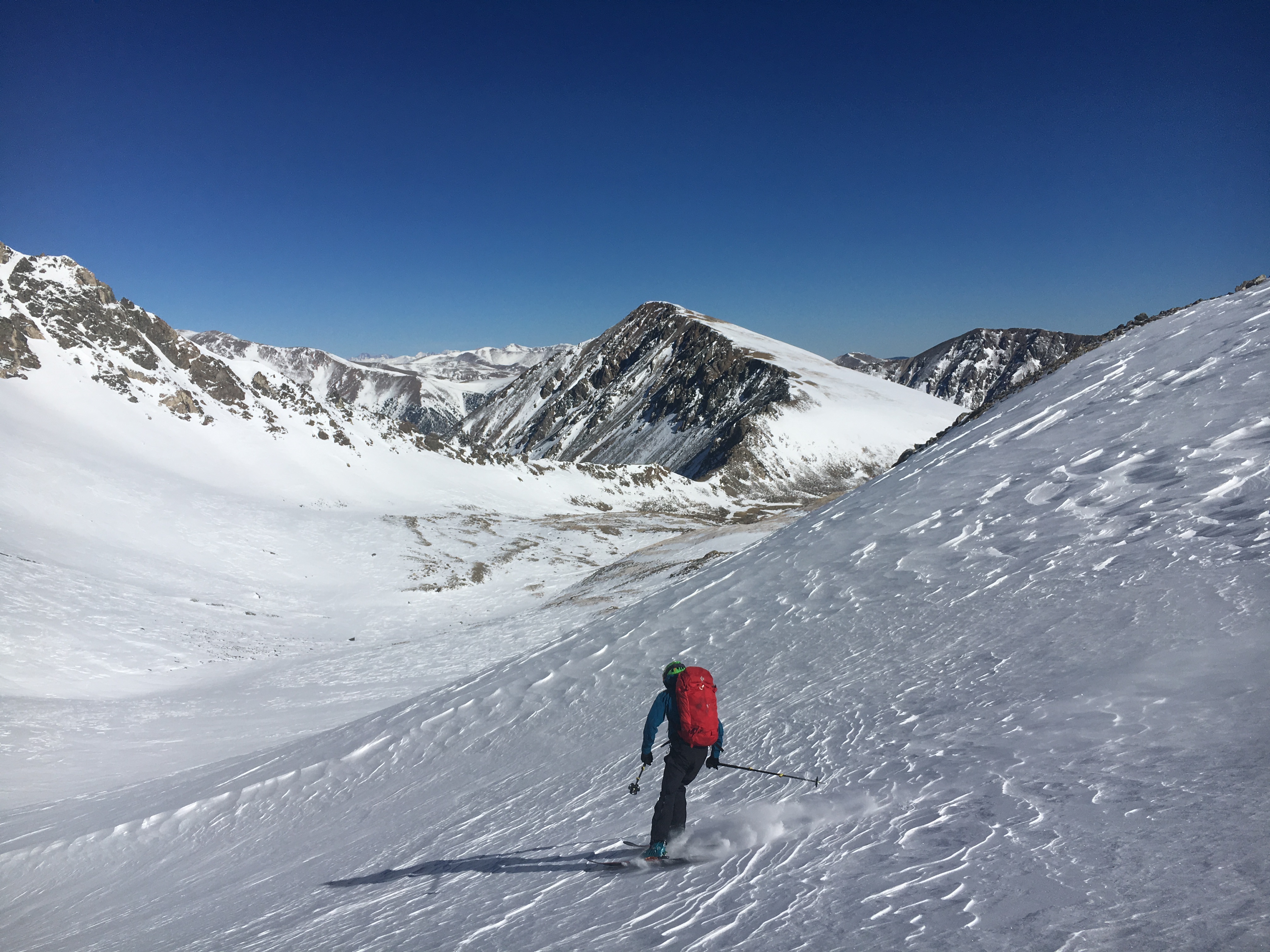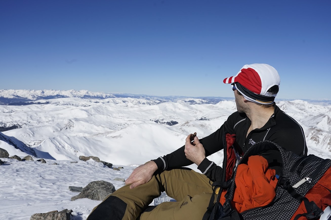 We dropped our skis just above the saddle and made a 20-minute push right on the very fine line that is threshold-at-14k’. The views were spectacular, with visibility about as good as it ever gets.