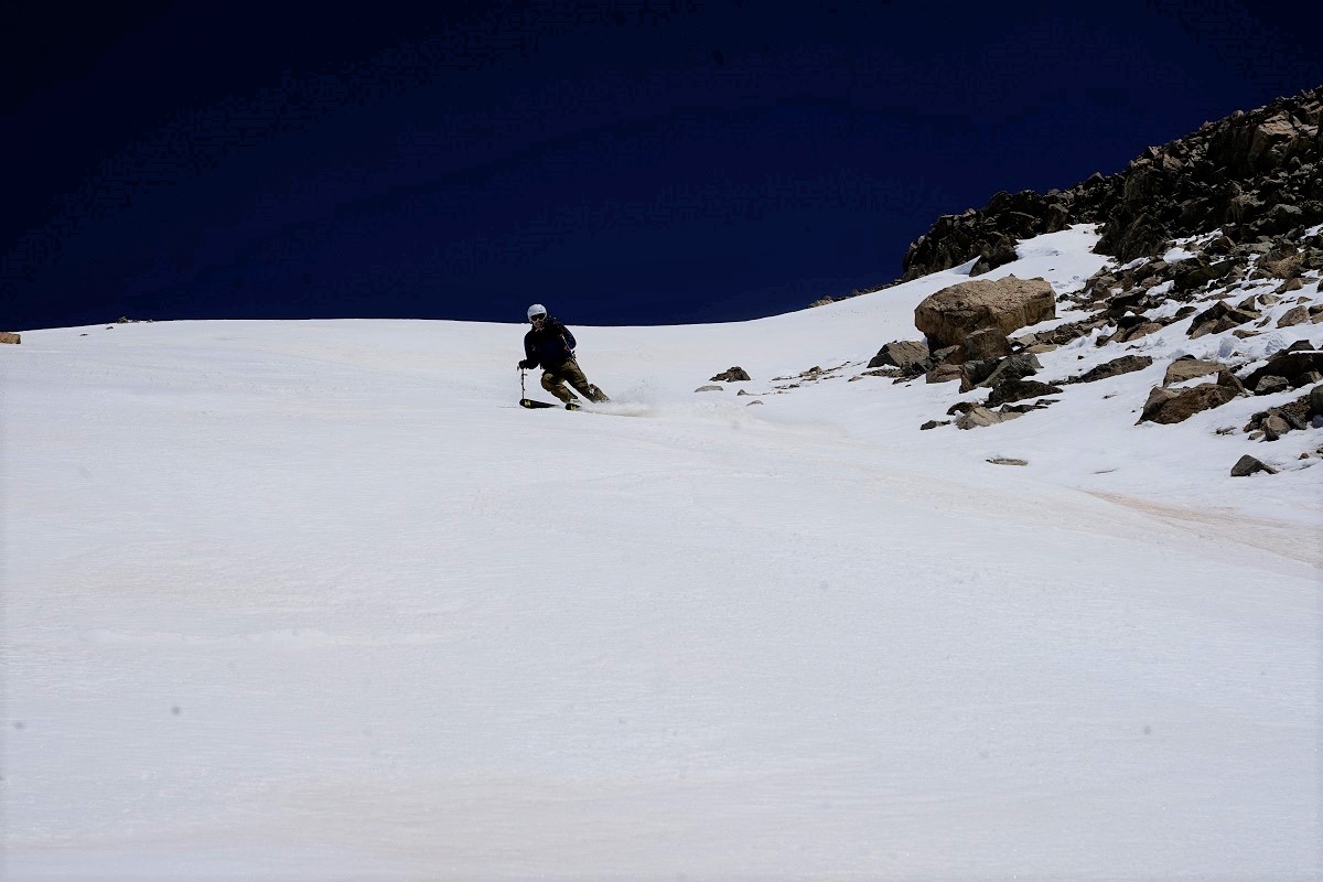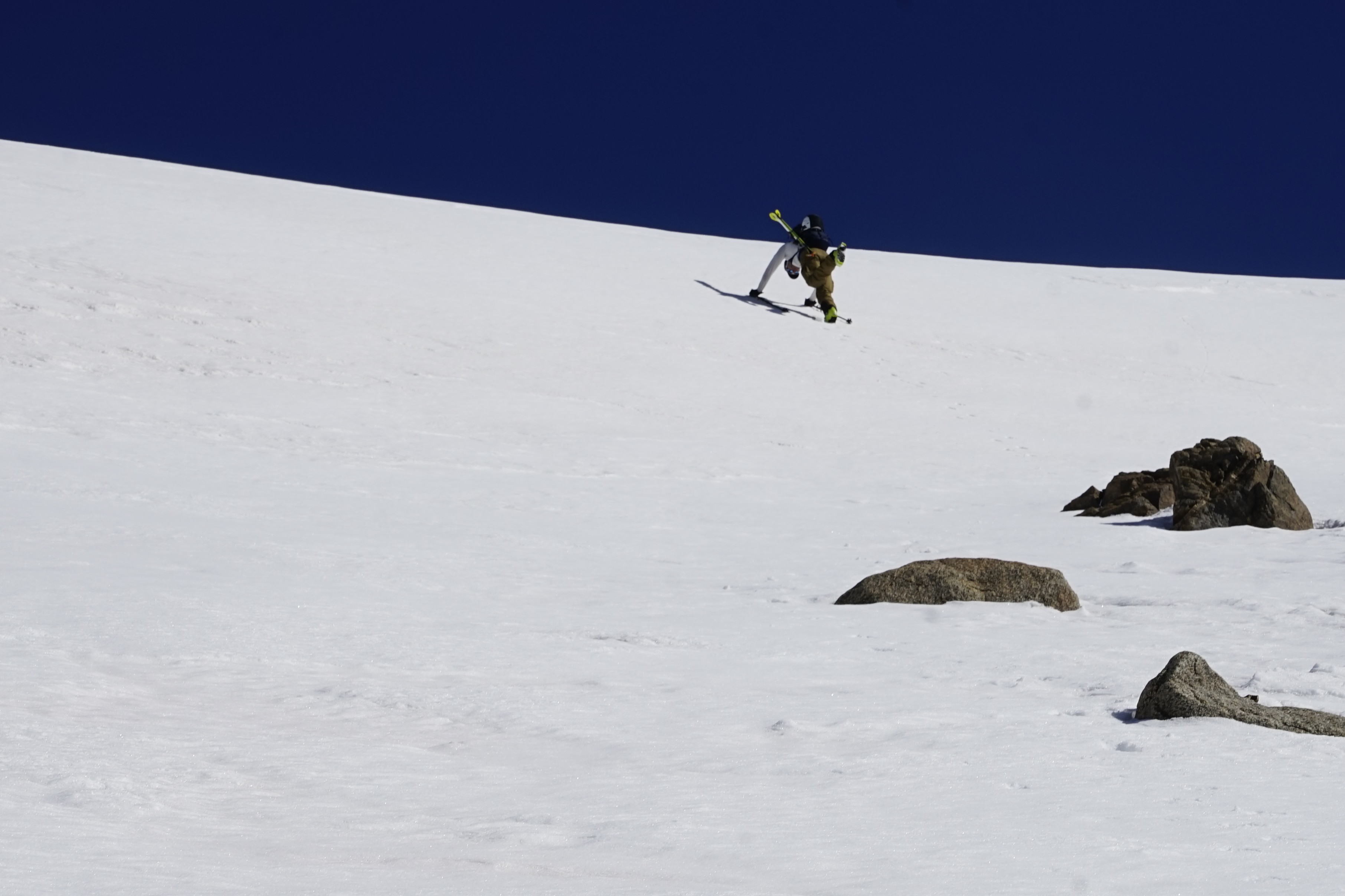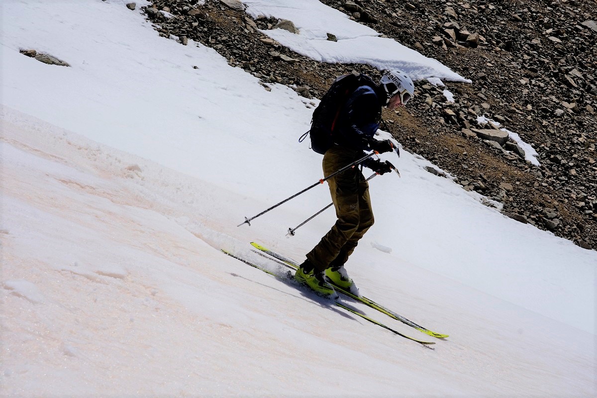 It was impressive to see the scope of the destruction, but worse was the damage the avalanche did to the couloir. There hasn’t been enough snow since March’s historic cycle to cover up the rock gouged out of the mountain, which tightened up portions of our ski line considerably.