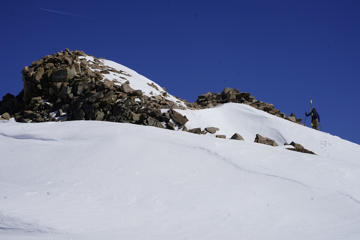 Half an hour after starting to move again we were at the summit, excited for a fun, easy couloir ski but concerned about ski conditions down in the trees.