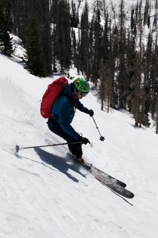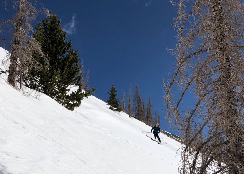 The good news was, once we were on the right line, we had a couple thousand feet of perfect, fun, moderately-steep corn skiing. It was so fun we didn’t take many photos, though did stop lower down to take a few shots.
