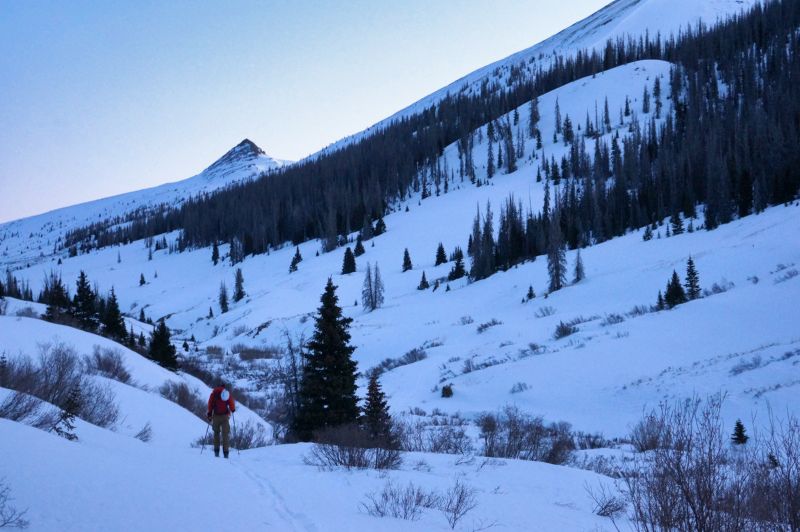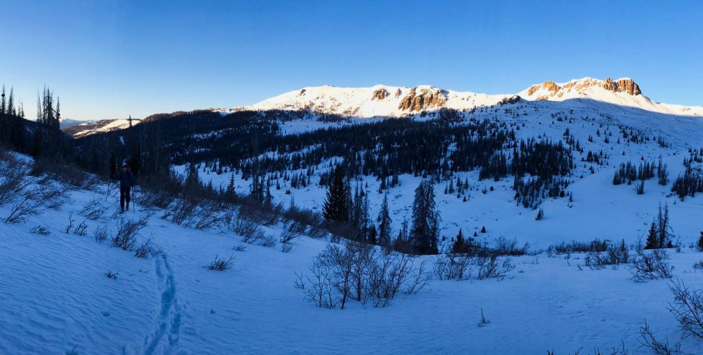 Our moods went from the gutter to elated as we continued along the road, as it had been plowed after the last storm. We were a little later than planned, but got to the expected parking spot and were skinning up the road at 5:15.