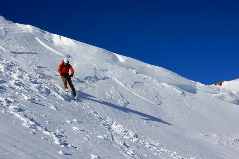 We were on schedule at the saddle. John found a weakness in the cornice and dropped in for the first 1,000′ of skiing for the day, which was pretty enjoyable.