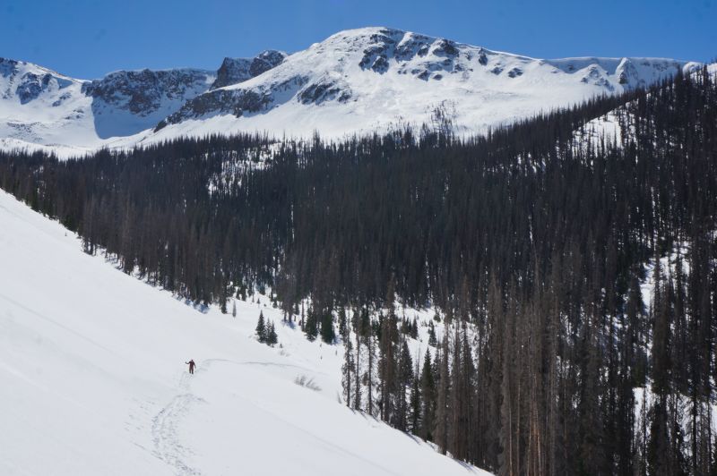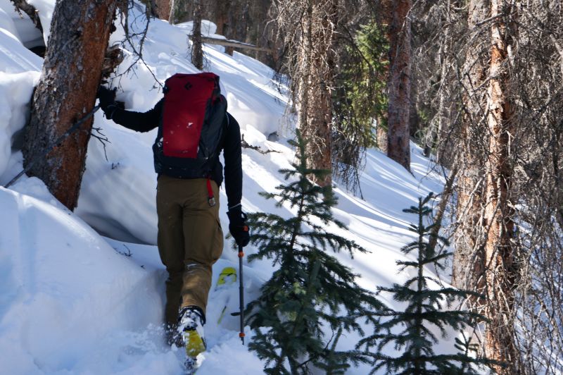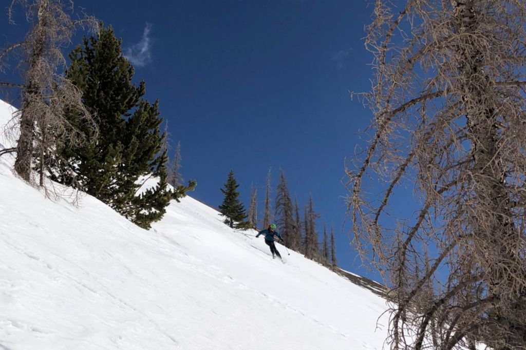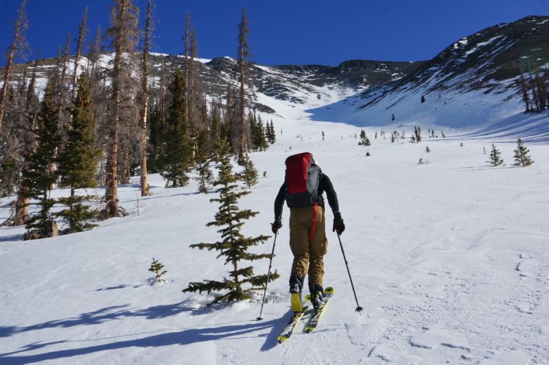 We debated between taking an obvious gully a little more right-ish and straight down through the trees, a little more to the left. Wanting to save distance and time, we went more direct. This was a mistake and cost us a few minutes. We hit the gully anyway, and poled along as far as we could before putting skins back on. Wanting to minimize trailbreaking, elevation, and overall distance, we cut the corner on a small peak in the middle of the basin. This led to some wallowing and adventure skinning, but I think did save some time.
