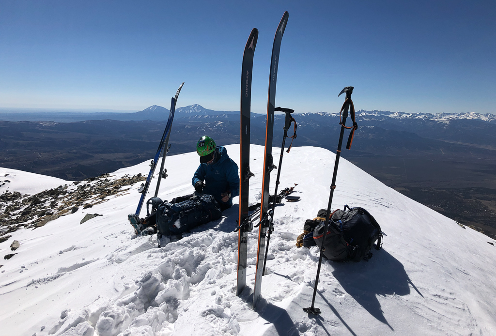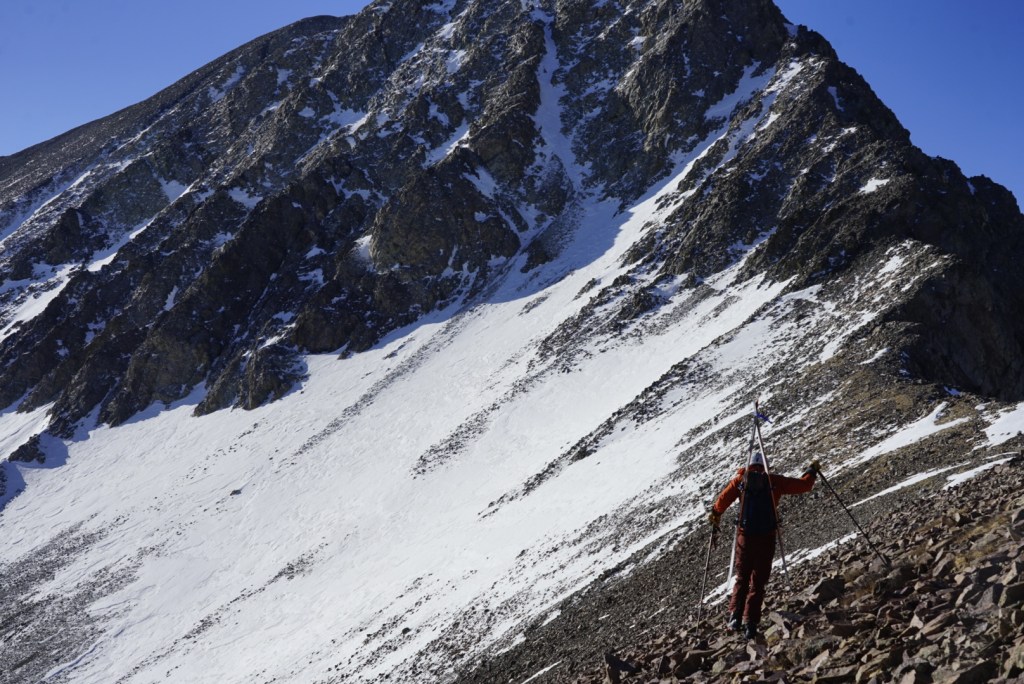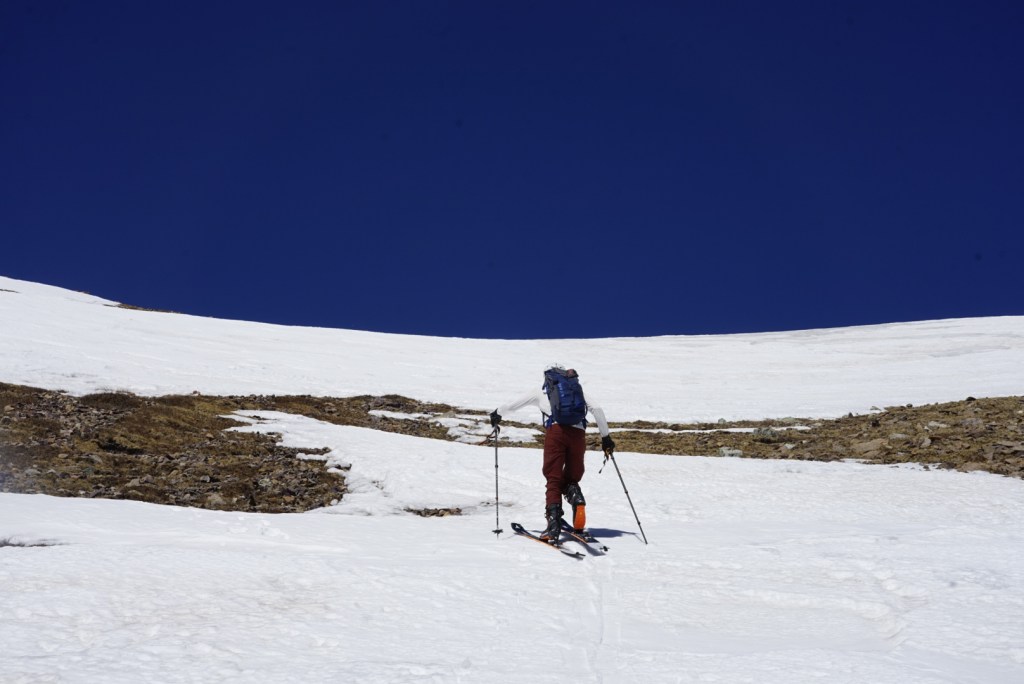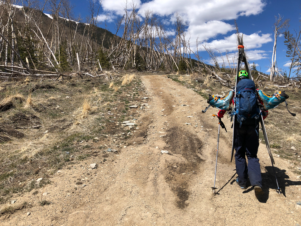 With ski season solidly in to “playoff season” I’ve been finally getting back at it regularly. The Sangres have been above normal in snowpack, so a couple weeks ago John and I drove down as close to the Mt. Lindsey trailhead as we could. A little after 11pm we hit a solitary snowdrift. It looked like if we could get through it we’d be able to drive quite a bit further, so we spent at least half an hour trying to get through it, without luck. The next morning we’d discover more (and deeper) drifts scattered along the road ahead, so ultimately it didn’t matter. About midnight we climbed in to the back of the truck for a couple hours of shuteye and were walking in shoes before 3am.