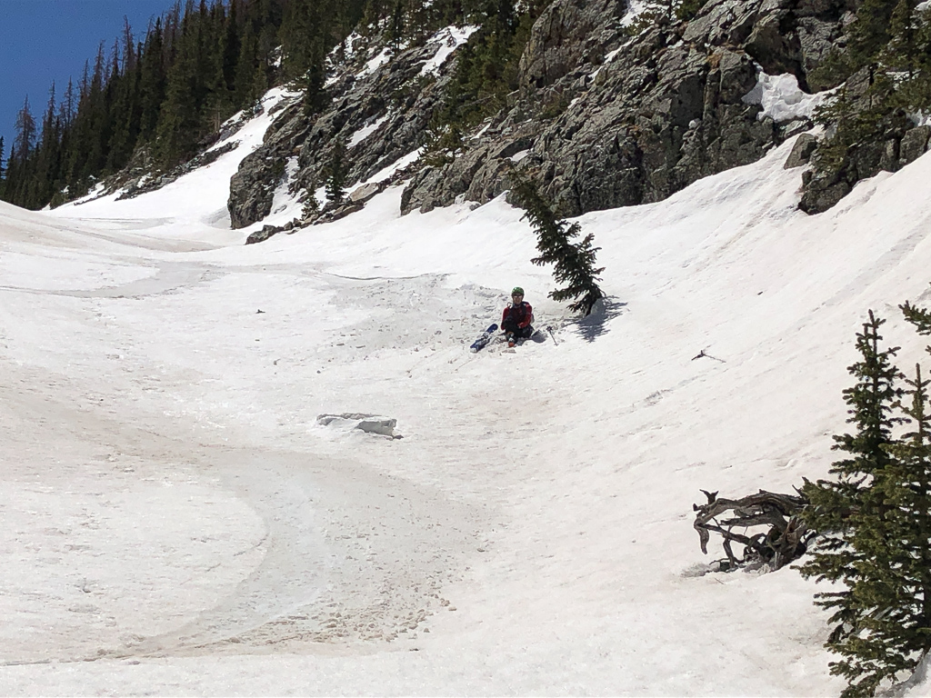 Unfortunately John hit a collapsing section of snow next to a small tree, and injured his ankle. Fortunately it wasn’t worse, as he was still able to ski and then hike out.