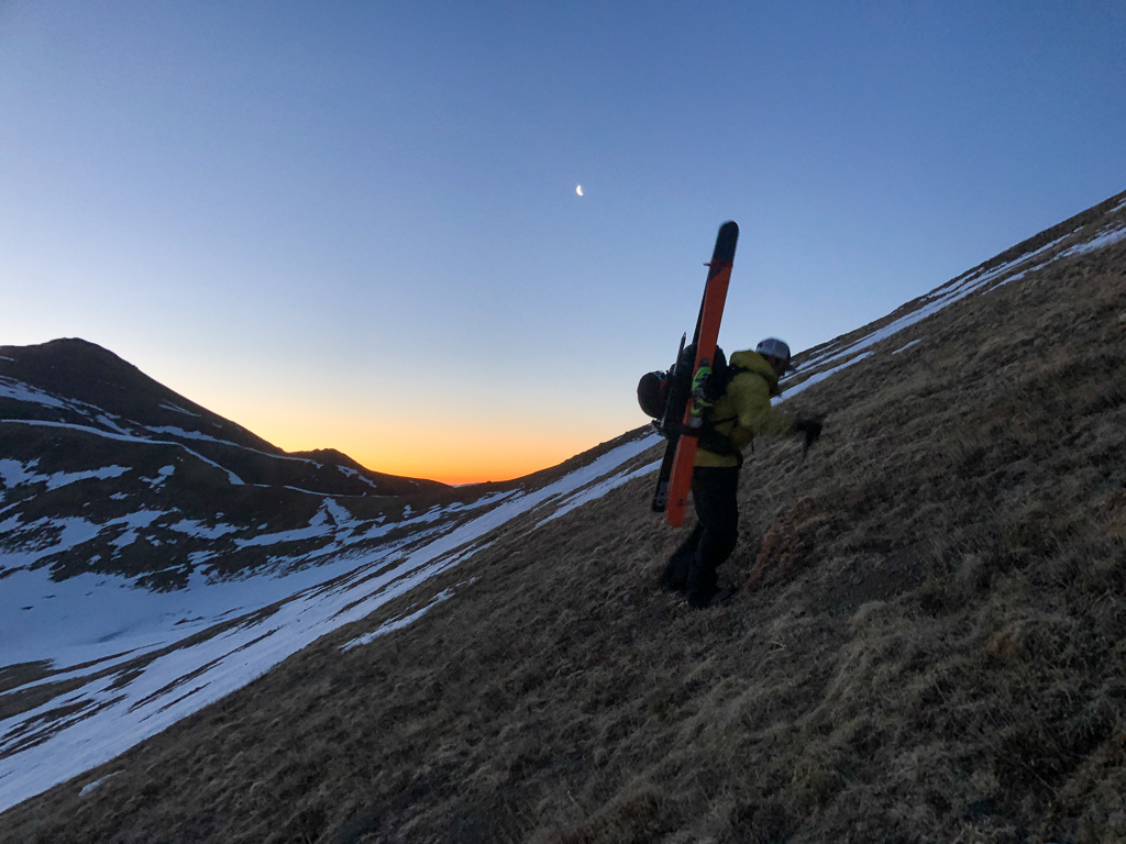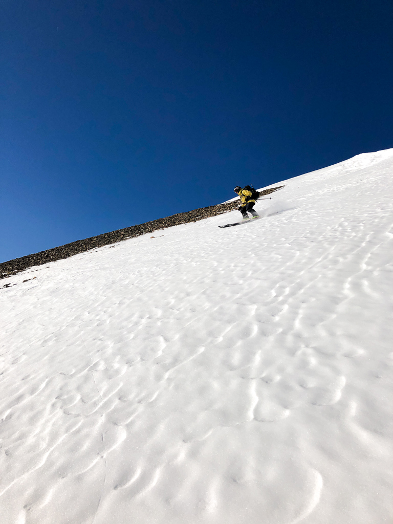 The snow hadn’t quite softened yet, but we had to ski and climb back to Redcloud before skiing, so we knew one of the skis wouldn’t have great snow.