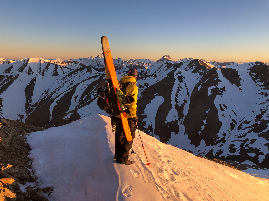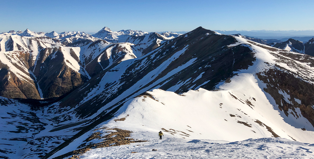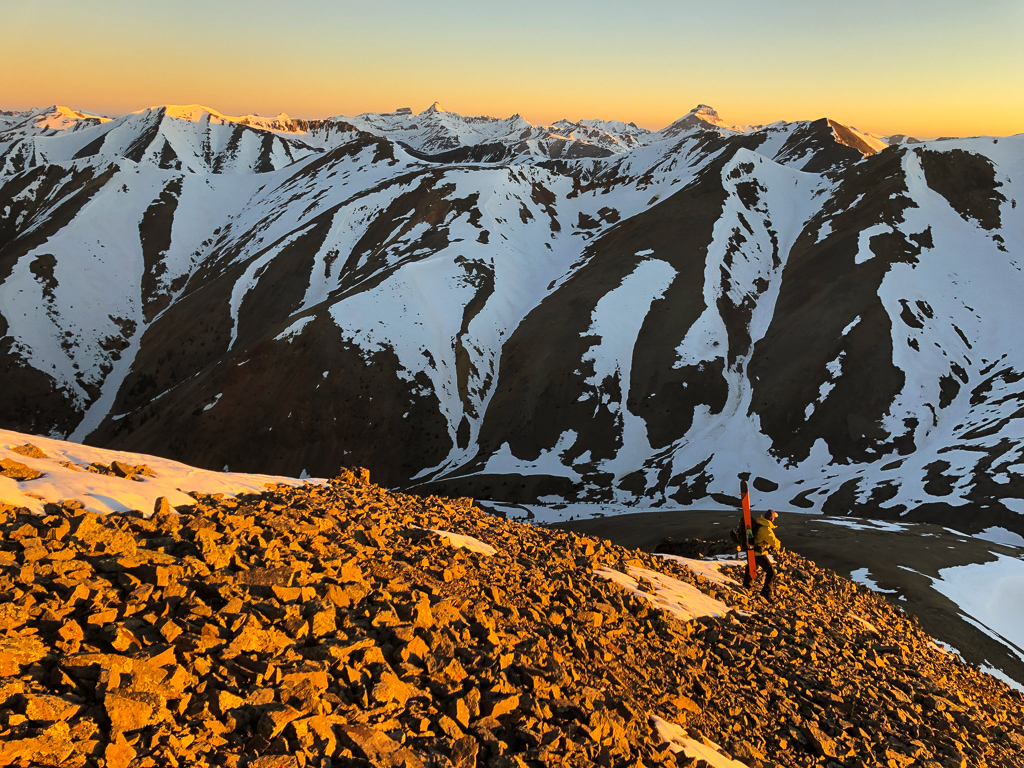 We topped out on Redcloud at 6:30. This time on top wouldn’t be our “ski descent” of Redcloud so I elected to hike in my shoes to Sunshine, while Mark was antsy to get on his skis and switched over to get across the ridge. Turns out it was roughly a wash, both of us happy with our choice and getting there within a few minutes of each other.