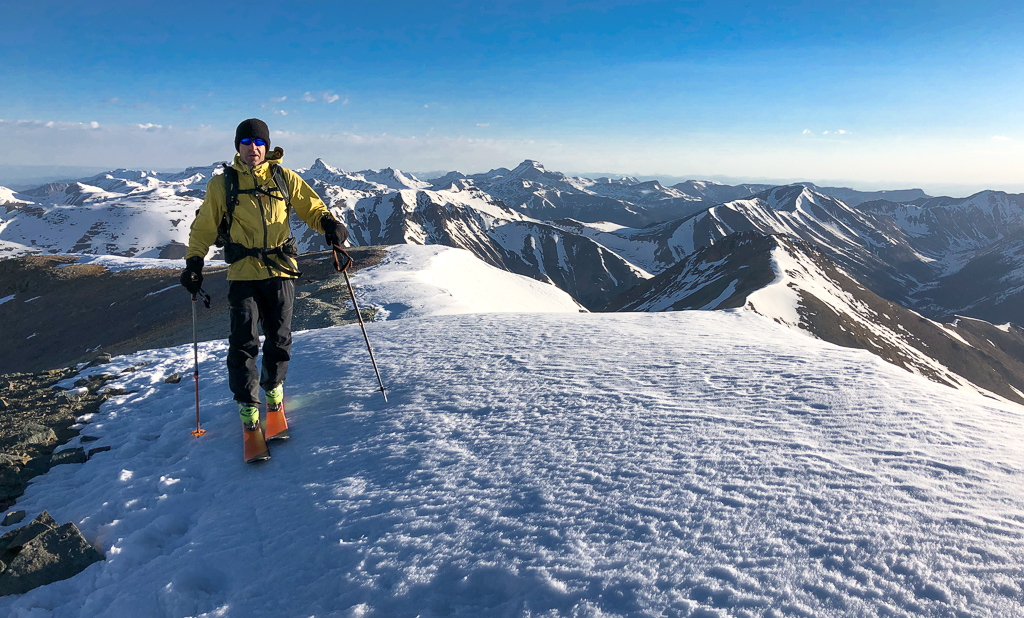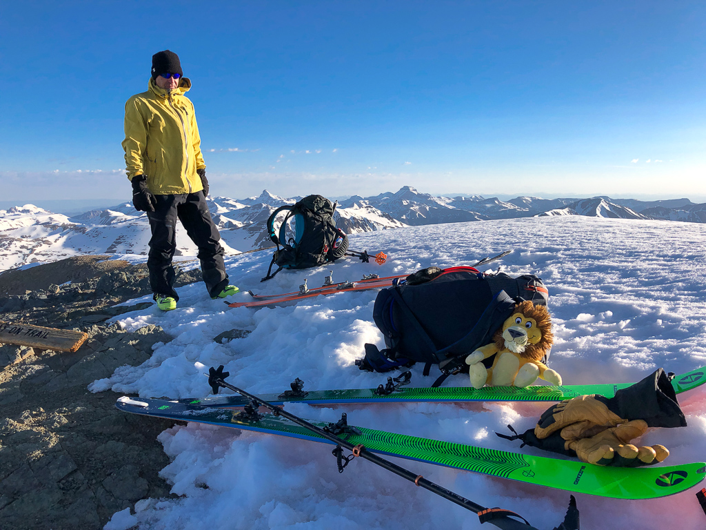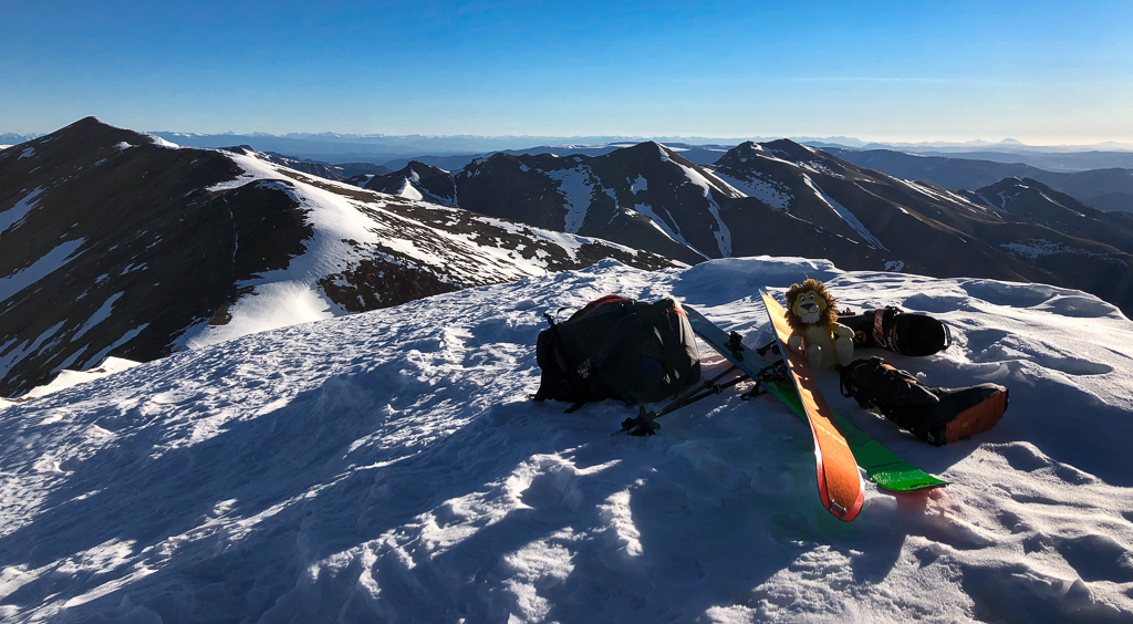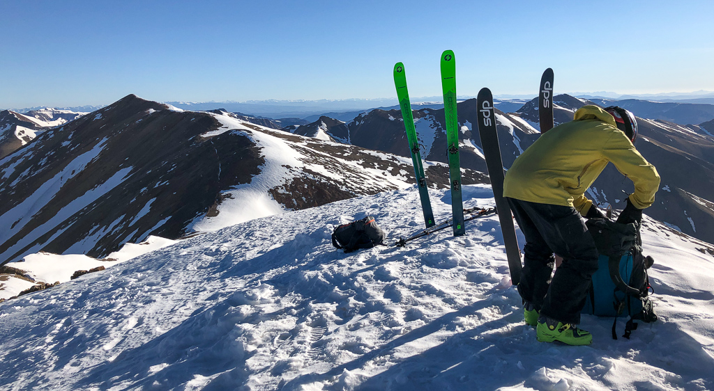 It was firm but not awful, and we enjoyed our ski down to a chute that regained the summit ridge of Redcloud. We switched to crampons, then back to skis when it flattened out enough, and an hour later we were back on top of Redcloud getting ready to ski.