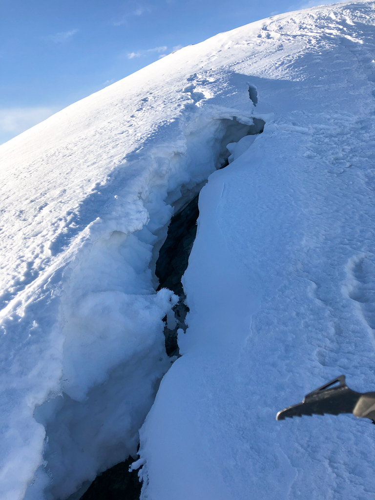 Coverage on the east face was good, and we were able to keep skis on all the way to the summit ridge. The cornice on top was pulling back from the ridge, and the narrow strip of snow left behind was a good reminder of how far back the things can go.