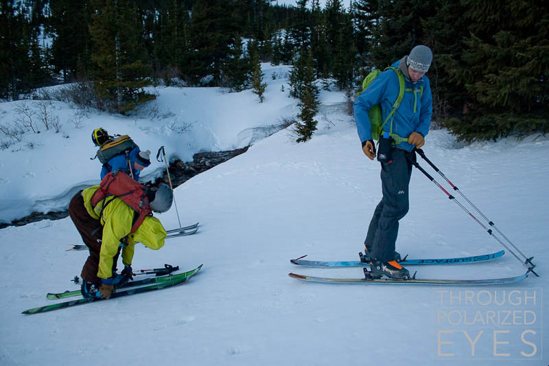 A major spring storm rolled in to Colorado late last week, bringing with it lots of snow. People in their right minds were enjoying an amazing powder day. Nine of us decided to take our shot and chance the weather. Besides, the forecast was for the storm to ease up and clear out by about 2pm, we would just have to fight our way through it most of the day. A few days ago things were dry pretty much to the summer trailhead, which would mean a 7 mile round-trip day with about 3,200′ of vertical. Things changed a bit, so we had a 14 mile day with roughly 5,000′ of vertical. I’d like to think Carl was saying something like “we have to go how far?” in this photo.