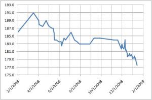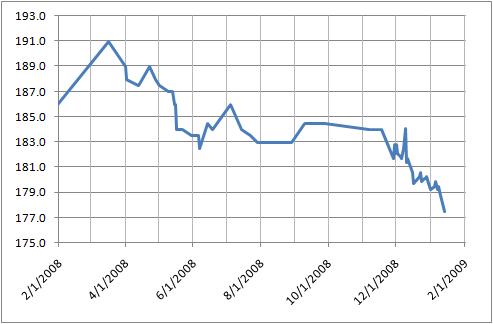 As of yesterday, I’m not longer considered overweight under the government’s highly-flawed BMI system. The chart below shows the past year. The first month and a half is likely not exactly as shown, as there are no data points between the start of the graph and the peak in March. Those gains were caused by lots of time in the weight room, and the past year I’ve been focusing on cutting down to pick up speed in running, cycling, climbing, etc. Having the Wii Fit to look at every day certainly help with tracking your weight, and when you know if you’re gaining, it’s that much easier to push yourself to cut back on fatty foods and step it up on the exercise.