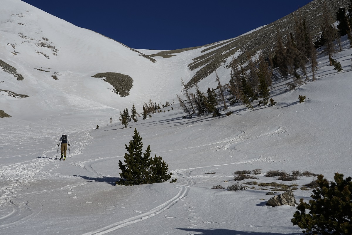 Based on the consistency of the snow (i.e. punchy and slabby) I had a bad feeling about how the rest of the way would go. It’s less than 2,000’ from the base of the couloir to the summit, which would ordinarily take less than an hour and a half. Unfortunately the snow was not well-consolidated (partially thanks to a foot+ dump less than a week prior). I led the climb up the Red Gully, spending three hours wallowing up the mountain. It was awful, slow, painstaking progress. And, of course, we’d have to ski back down it as well.