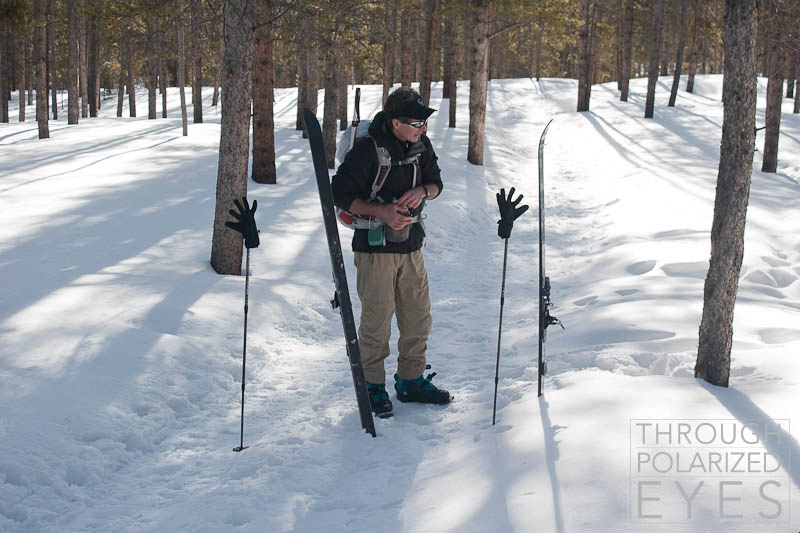 We didn’t get an early start by any means yesterday. Jim and I decided on a 9am start from the Leadville Fish Hatchery, which meant I got to sleep in until 5am for a winter 14er climb and ski descent – unheard of! Granted it was two days after the DST changeover, but that’s still pretty late. On the drive out from Leadville I was able to scope out my line, and was pretty happy with what I saw. We made our final preparations in the parking lot, with Jim electing to go with nordic wax rather than skins for the approach. This didn’t work too well on the icy, spring-like morning snow. A few rewaxing sessions later, Jim threw on the skins and we were off.